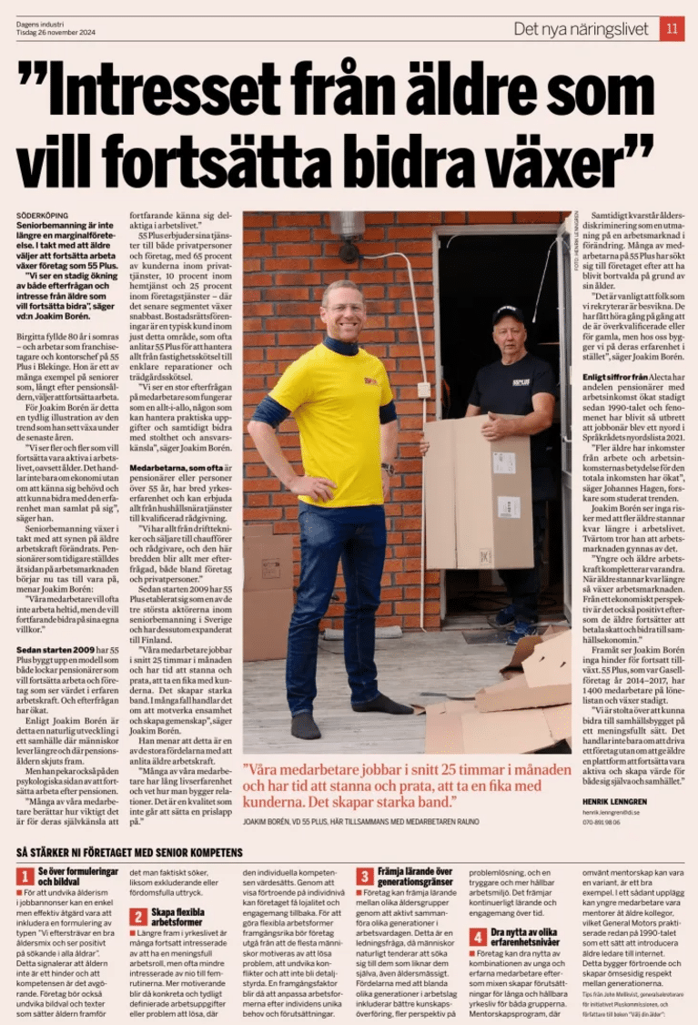 I Dagens Industri den 26:e november sätter man strålkastarljuset på seniorbemanning. Roligt och viktigt tycker vi på 55Plus!